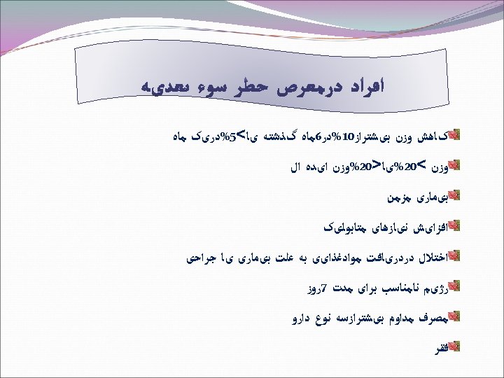 B. Nutrition Intake Historory If the client has one or more of the following manifestations, circle it, proceed to section E, and consider the client AT NUTRITIONAL RISK. If the client has none of these manifestations, proceed to section C. ●Diarrhea(>500 ml for 2 days) ●Vomiting(>5 days) ●Reduced intake(1/2 normal intake for more than 5 days) C. Ideal body weight standards Compare the client’s current weight for height to a chart of ideal body weight. If the client weighs less than 80%of ideal body weight, proceed to section E and consider the client AT NUTRITIONAL RISK. If the client weighs more than 80% of ideal body weight, proceed to section D.