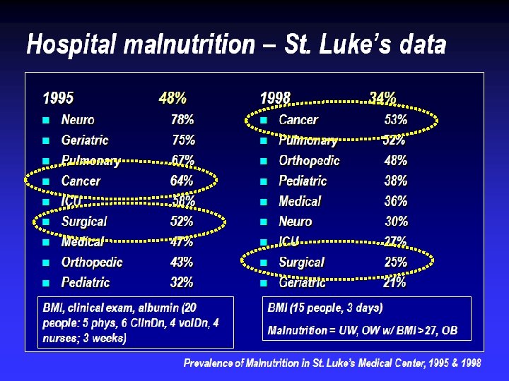 Malnutrition in the Philippines Hospital BMI <18. 5 BMI >30 SGA “C” 1. Marikina, Rizal (Amang Rodriguez Medical Center) 38% 15% - 2. Lipa City, Batangas (Mary Mediatrix Med Center) 18% 5% - 3. Quezon City (St. Luke’s Medical Center) 6% 12% - - - 42% 5. Pasig (The Medical City) 4% 14% - 6. Alabang (Asian Hospital Medical Center) 8% 20% - 7. Cabanatuan City (Premiere Medical Center) 15% 9% - 8. Mandaluyong (St. Martin De Porres Hospital 12% 8% - 4. Manila (Philippine General Hospital) Mean 14. 4% 11. 8%