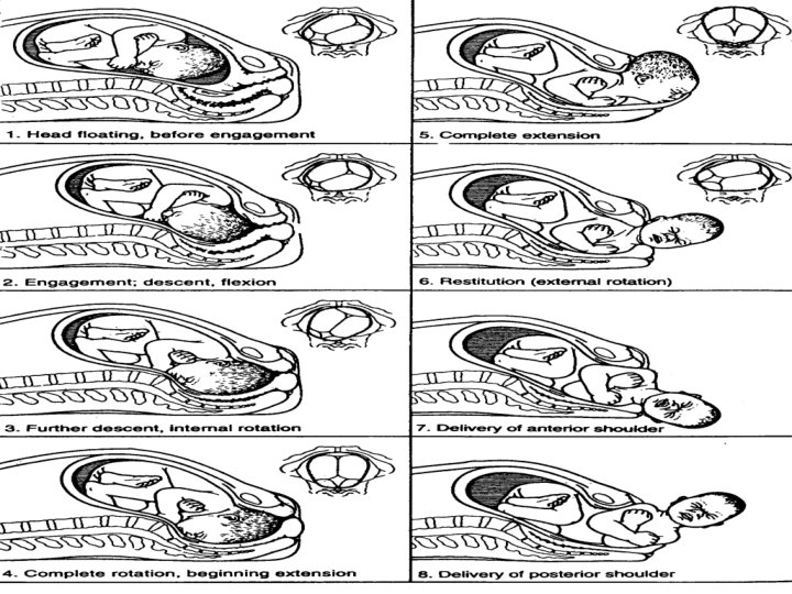 • The root of the nose is pressed against the bone. • The vertex is born by flexion and followed by the occiput. • Then the head extends, so the face and chin emerging from under the pubic arch. • The vulval orifice is stretched by the occipito -frontal instead of the sub-occipito-frontal diameter with a difference in size of 1. 5 cm. and a severe perineal tears may result.