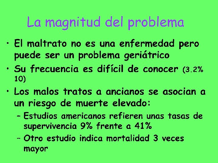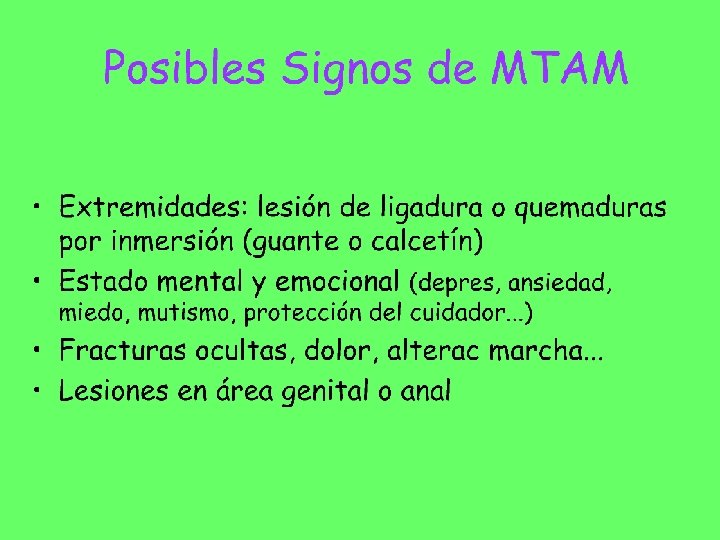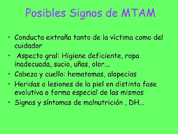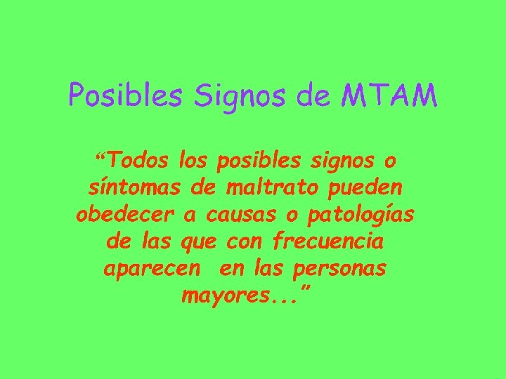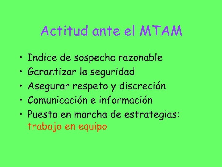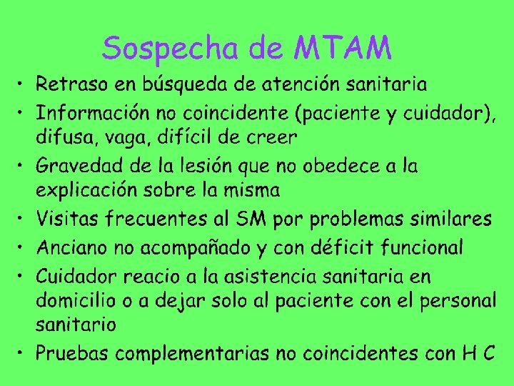 Actitud ante el MTAM • El maltrato en sentido estricto no suele ser un problema sanitario sino social • Somos los profesionales de la salud los que nos encontramos en la mejores condiciones para acceder al problema ya que somos los “únicos autorizados” para acercarnos a la integridad física, mental y social de los maltratados • Hecho que genera responsabilidades ineludibles y su ignorancia puede supone mala praxis