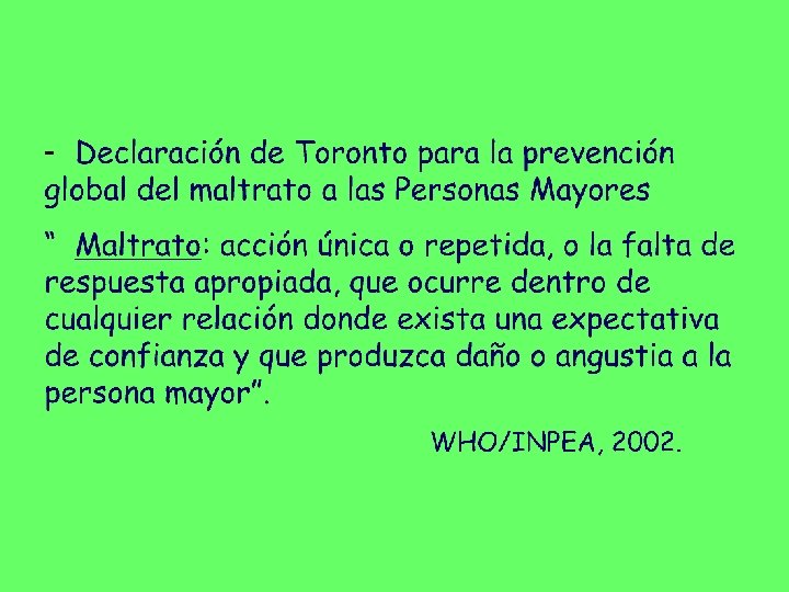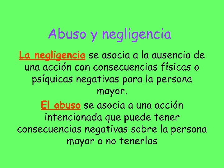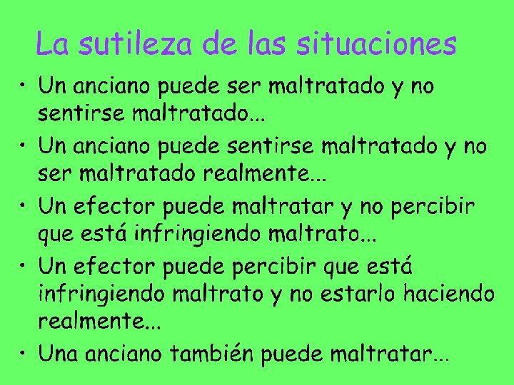 Hay circunstancias frecuentes en el proceso de envejecimiento que pueden favorecer un trato no adecuado: * Dependencia * Fragilidad * Expectativa de confianza