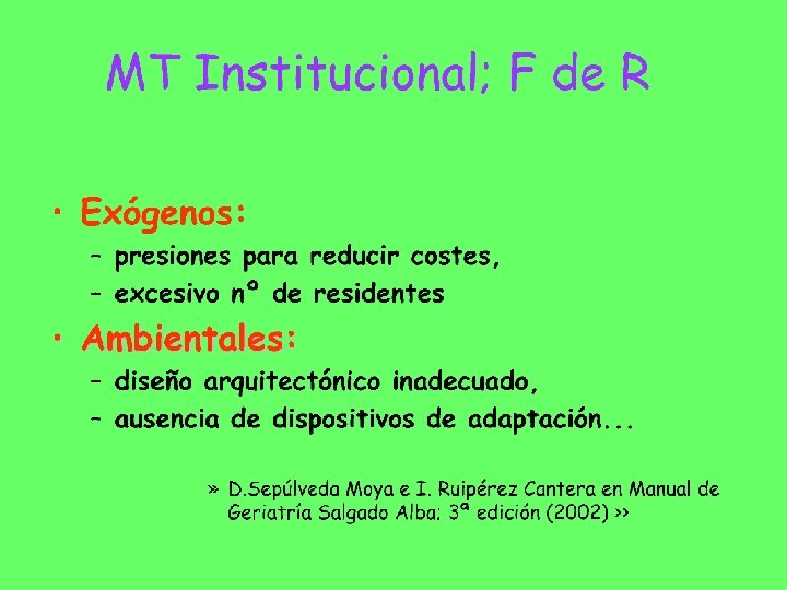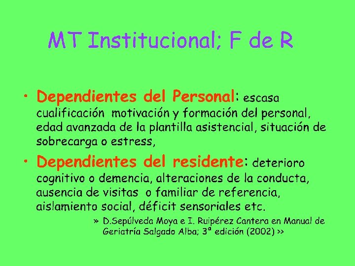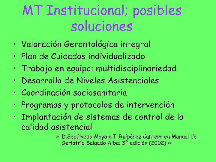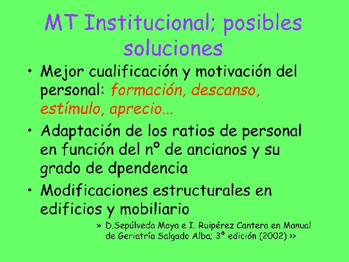 MT INSTITUCIONAL. . . los malos tratos también se producen en la institución de ámbito sanitario o social, a veces favorecidos por la organización, la rutina asistencial o las normas de la propia institución y pueden ser causados por profesionales. Negar este hecho no sólo no facilita sino que dificulta su prevención. Ni la especialización, ni la teórica sensibilidad ante esta población de las instituciones y profesionales dedicados al cuidado de las personas mayores, son garantía de una protección automática frente a los MTPM. . . (Malos tratos a las Personas Mayores. Guia de actuación pag. 13) IMSERSO. SEGG