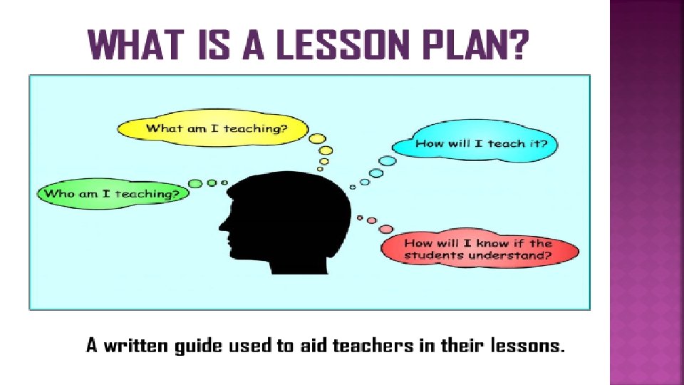 Lesson Plan Lesson • A period of time in which a person is taught a subject. It means something from which useful knowledge can be learned. Plan • A set of decisions about how to do something in the future. • Planning helps you to reduce uncertainty or panic and gives you confidence and clarity.