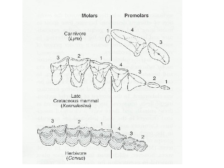 Mammal Characteristics Teeth 2) permanent teeth: replace deciduous teeth with maturity; consist of incisors, canines, premolars, & molars - tooth eruption patterns useful for aging individuals, if extensive literature is available, e. g. , whitetailed deer