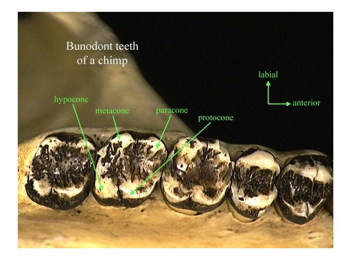 Mammal Characteristics Teeth Types of Molars 1) bunodont: rounded, separate cusps for crushing/grinding food - pigs, rodents, primates, carnivores 2) lophodont: cusps form ridges (lophs) - herbivores