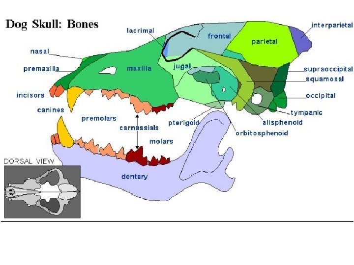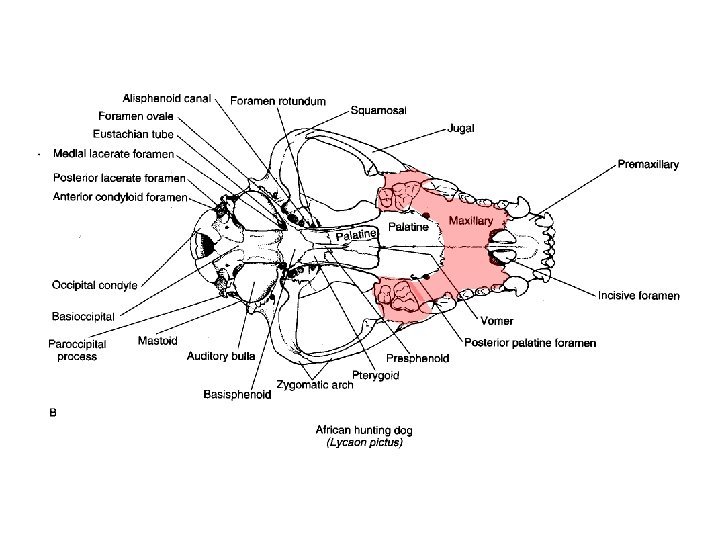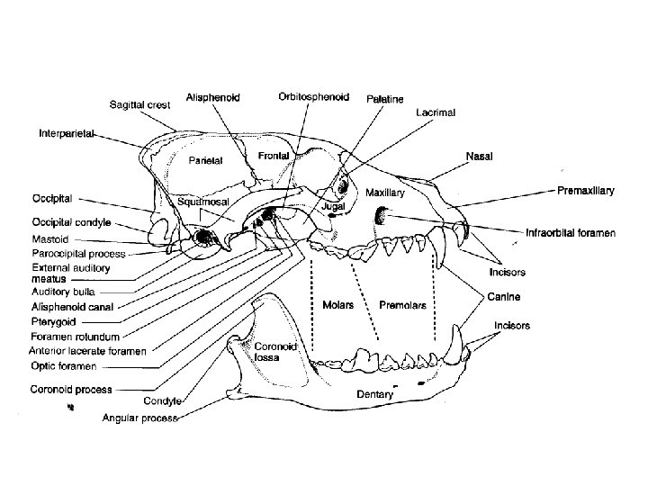 Mammal Characteristics Skull - Cranium • premaxillary - anterior portion; origin for upper incisor • nasal - anterodorsal surface following premaxillary • maxillary - behind premaxillary; bears all upper teeth except incisors • infraorbital foramen - opening in maxillary; passage for blood vessels & cranial nerve