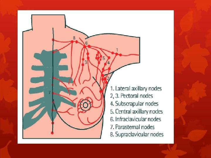 LYMPHATIC DRAINAGE Subareolar lymphatic plexus Lateral quadrant………anterior or pectoral………. axillary Medial quadrant………. . parasternal…… ……internal thoracic