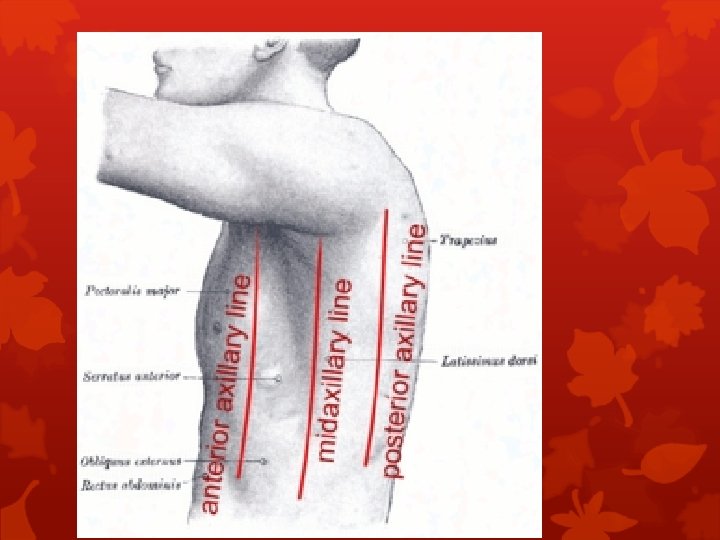AXILLARY LINES The anterior axillary line is a line on the anterior torso marked by the anterior axillary fold Mid axillary line passes vertically down the body from the apex of the axilla (armpit). The posterior axillary line is a line on the posterior torso marked by the posterior axillary fold