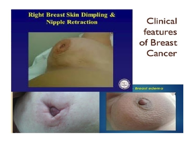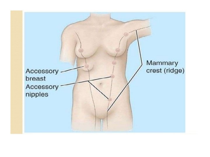 Clinical anatomy • • • Skin incisions over breast Retraction of skin and nipple Congenital anomalies- ‘’thelia’’ and ‘’mastia’’ Lymphadenopathy Krukenberg’s tumour Breast examination
