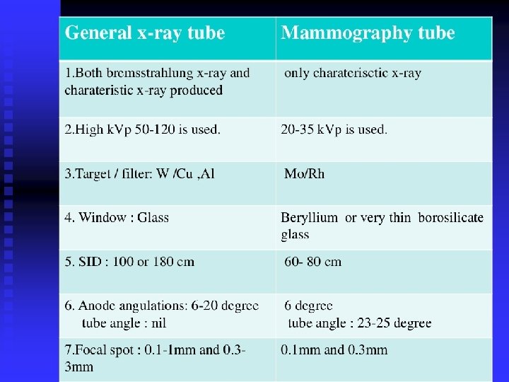 Target / filter material • Need good differentiation of low contrast structures • Need very high spatial resolution for microcalcifications