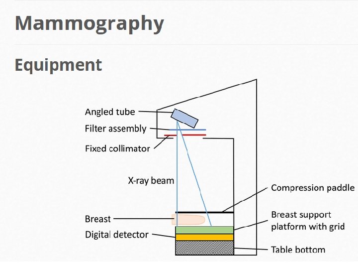 Mammography • Is a technique for the radiographic examination of the breast. • This a challenging imaging task since connective tissue, glandular tissue, skin and fat must be visualized but all have very similar attenuation coefficients and thus produce little subject contrast. • Furthermore, it is necessary to image blood vessels, ducts and micro calcifications as small as 100 m diameter.