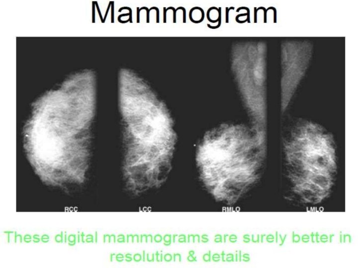 Advances in Mamography • Three recent advances in mammography include: o digital mammography, ocomputer-aided detection and o breast tomosynthesis