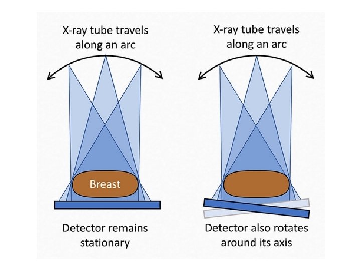 Tomosynthesis • Superimposed tissue can mask pathology and, often, the pathology in breast disease can be very subtle. Breast tomography uses digital radiography to reconstruct planar images of sections of the breast. There are two main methods of acquiring breast tomosynthesis: • The x-ray tube traverses along an arc acquiring images as it travels and the detector remains stationary • The x-ray tube traverses along an arc and the detector also rotates • The images are then reconstructed using filtered back projection or iterative reconstruction.