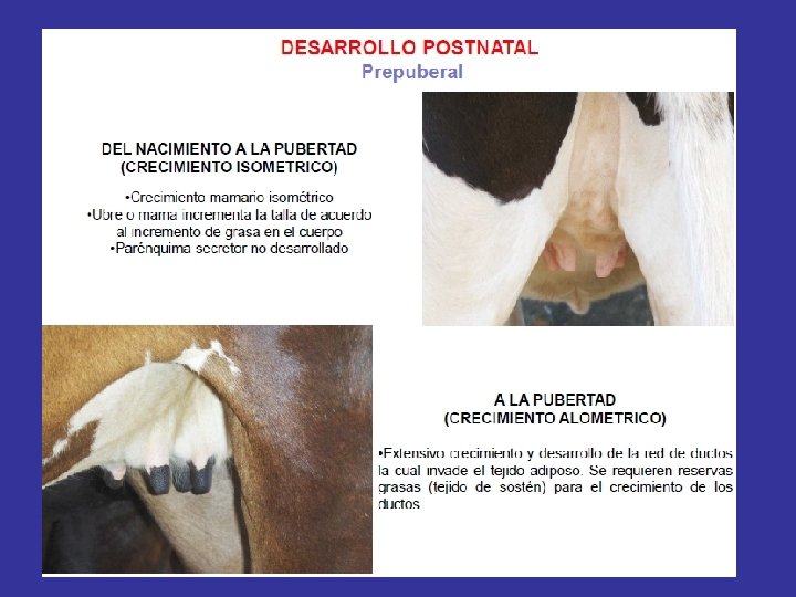Desarrollo prepuberal: Nacimiento a la Pubertad Crecimiento mamario isométrico hasta el primer tercio de edad antes de la pubertad. • Ganado vacuno: hasta 3 meses. • Ovejas y cerdas muy rápido • Humanos mas prolongado. – La mama o ubre se incrementa en tamaño debido a la acumulación de tejido adiposo (grasa) y tejido conectivo – No hay desarrollo de tejido secretor Crecimiento mamario comienza a ser alométrico • En vacunos, según el grupo racial, ocurre desde los 4 meses hasta el año • Intenso y extenso crecimiento y desarrollo de la red de ductos alrededor y entre el tejido graso. Indispensable la base de tejido graso