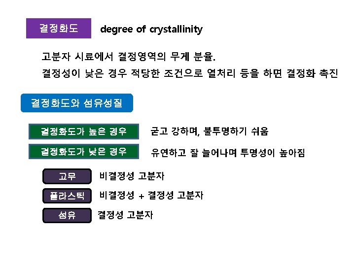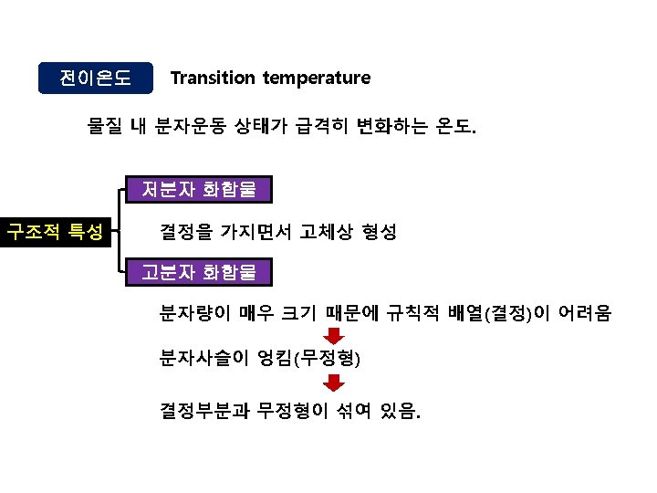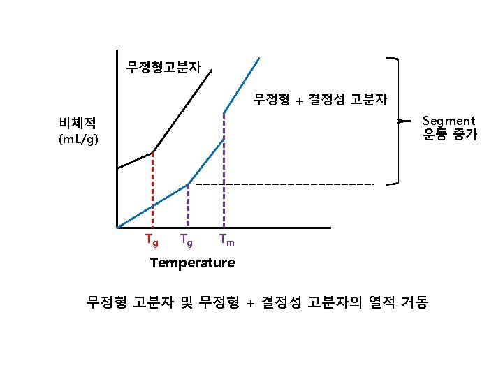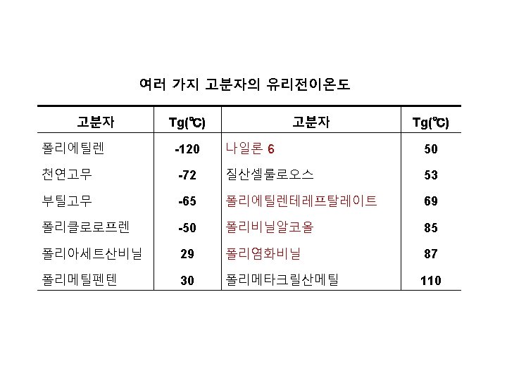 heat 고분자 유리전이온도 무정형 부분이 먼저 움직임 Glass transition temperature, Tg 물성변화 [고무상 탄성체로 변화 ] 용융체 융해하기 시작함 2차전이온도 Second order transition temp. 융점 Melting temperature, Tm 1차전이온도 First order transition temp.
