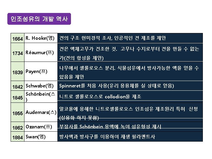 영국 The textile Institute의 정의 All filaments manufactured by as distinct from these which occur naturally. 미국 A. S. T. M. 의 정의 American society of Testing Materials A class name for various general of fibers(including filaments) produced from fiber-forming substances. 독일의 정의 Chemiefaser = Sammelbezeichnung für alle kunstfaser 명칭