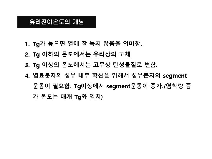 Glass state Rubber state E Tg Melt state Tm 섬유고분자의 열에 의한 상태 변화