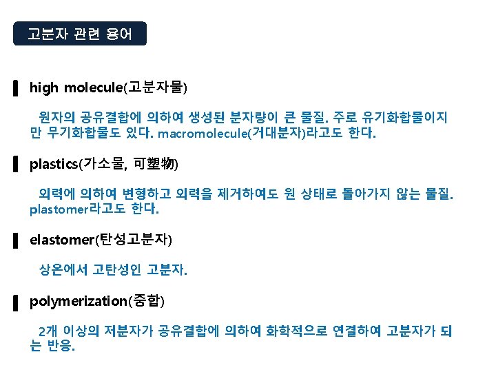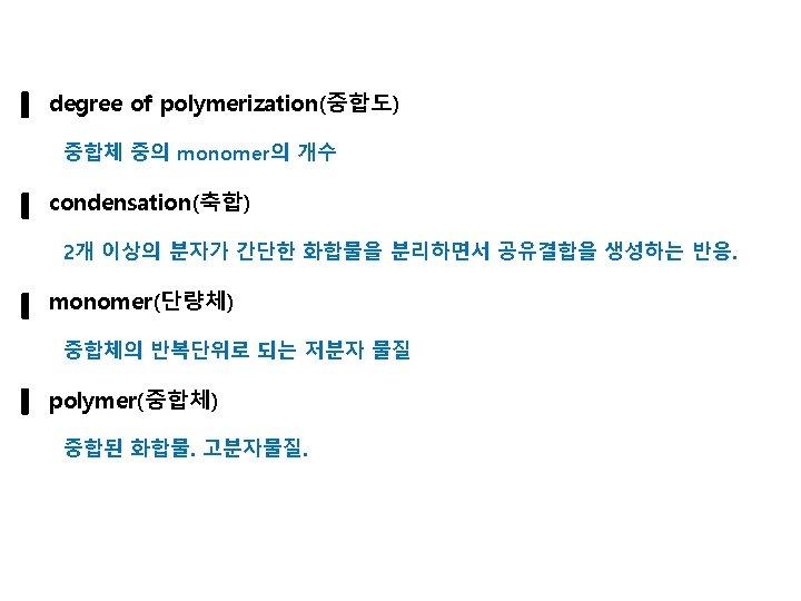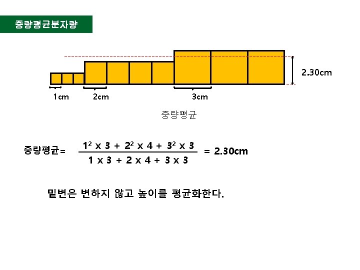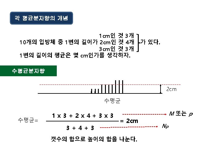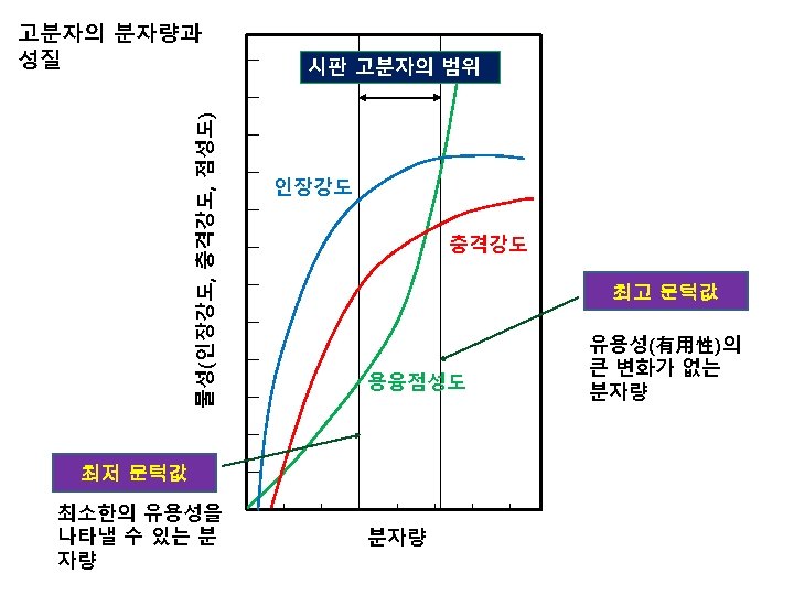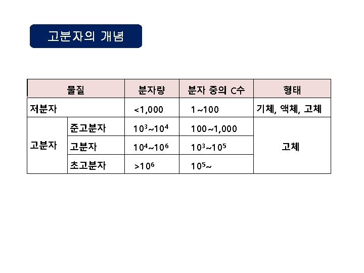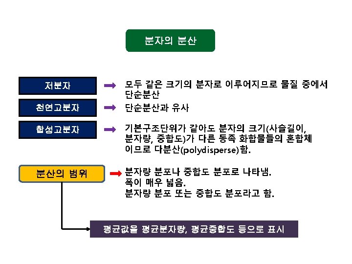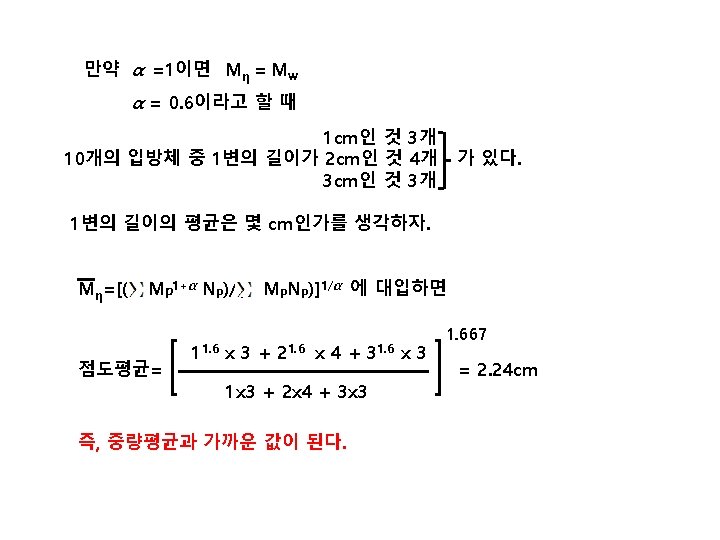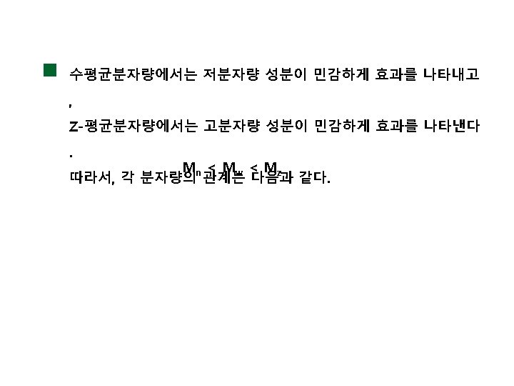 예 분자량 500인 고분자 100개 분자량 1, 000인 고분자 20개 분자량 1, 500인 고분자 40개 로 구성된 고분자의 중량 평균 분자량은? 2 Mw = = = = M p Np 5002 x 100 + 1, 0002 x 20 + 1, 5002 x 40 500 x 100 + 1, 000 x 20 + 1, 500 x 40 250, 000 x 100 + 1, 000 x 20 + 2, 250, 000 x 40 50, 000 + 20, 000 + 60, 000 25, 000 + 20, 000 + 90, 000 135, 000 130, 000 = 1038. 46 130, 000