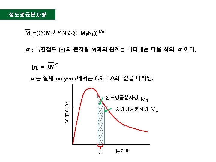 [ ] = KMα 양변에 log를 취하여 log [ ] = log K + α log M K=1. 49 x 10 -4 α =0. 92 log 216 = log (1. 49 x 10 -4) + 0. 92 log M = log 1. 49 – 4 log 10 + 0. 92 log M 2. 334 = 0. 173 - 4 + 0. 92 log M 6. 161 = 0. 92 log M = 6. 6967 M=106. 6967 =4, 973, 933. 8