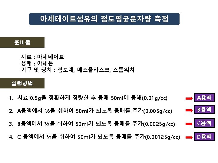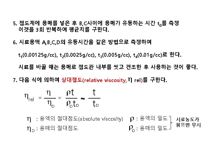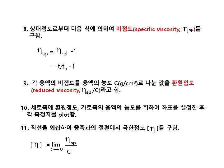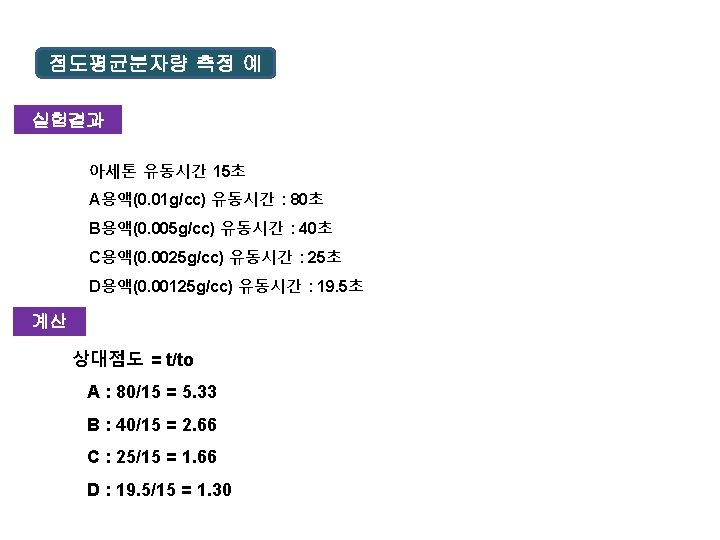 비점도 = t/to -1 A : 5. 33 -1 = 4. 33 B : 2. 66– 1 = 1. 66 C : 1. 66 -1 = 0. 66 D : 1. 30 – 1 = 0. 30 환원점도 sp /C A : 4. 33/0. 01 =433 B : 1. 66/0. 005=332 C : 0. 66/0. 0025=264 D : 0. 30/0. 00125=240