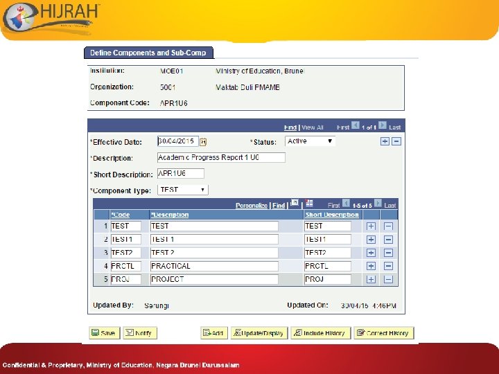 How to use 1. Navigate to the Screen via Menu Path 2. Click Add a new Value Tab 3. Enter Academic Institution 4. Enter Academic Organization 5. Enter Component Code 6. Click Add Button Refer also to Online Help: Navigate to Manage Assessment > Define Assessment Structure > Manage Assessment and Sub-Assessment Types http: //help. ineis. moe. gov. bn/as/as_1. 2. php#2