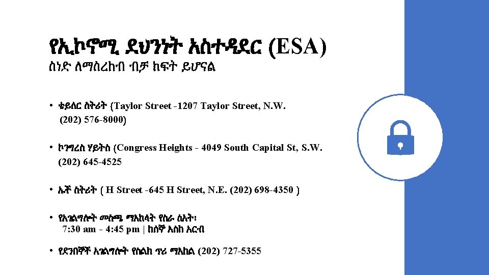 Ethiopian Community Center DC የዲሲ የኢትዮጵያ ማህበረሰብ ማዕከል Website | ድህረ ገጻችን (ዌብሳይት): https: //www. ethiopiancommunitydc. org/ For general support, concerns and questions you may have, please | ለአጠቃላይ ድጋፍና መረጃ፣ ሊኖርዎ ለሚችሉት ስጋቶች እና ጥያቄዎች እባክዎን በ፦ Email: info@ethiopiancommunitydc. org ኢሜል ይላኩልን or send us a message on Facebook | ወይም በፌስቡክ መልዕክት ይላኩልን Ethiopian. Community. DC Call/Text | ይደውሉልን ወይም ቴክስት ያርጉ: (202) 670 -6271