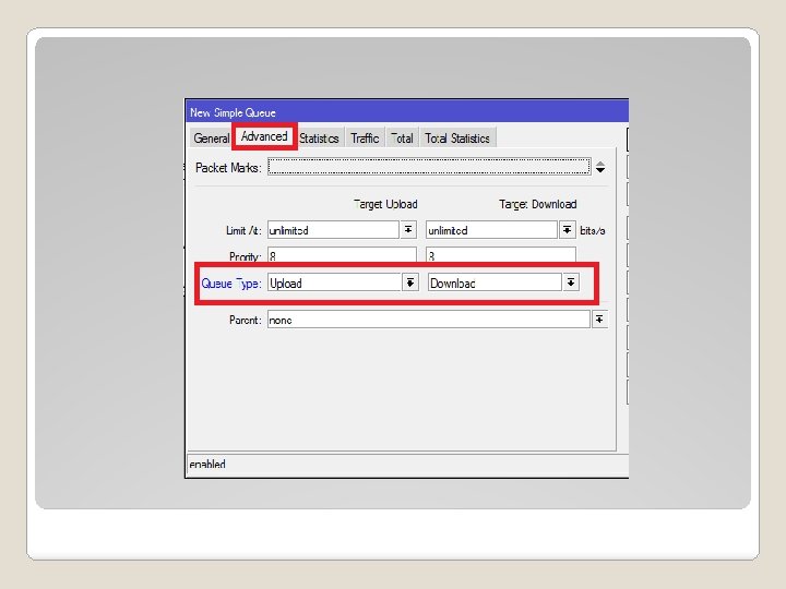 IMPLEMENTASI KE DALAM SIMPLE QUEUE 1. Setelah membuat rules PCQ tadi sekarang kita akan implementasikan ke dalam “simple queue” dengan cara : Klik Queues > masuk ke tab “Simple Queues” >klik [+] untuk menambahkan tipe queue baru lebih lengkapnya liat gambar dibawah ini