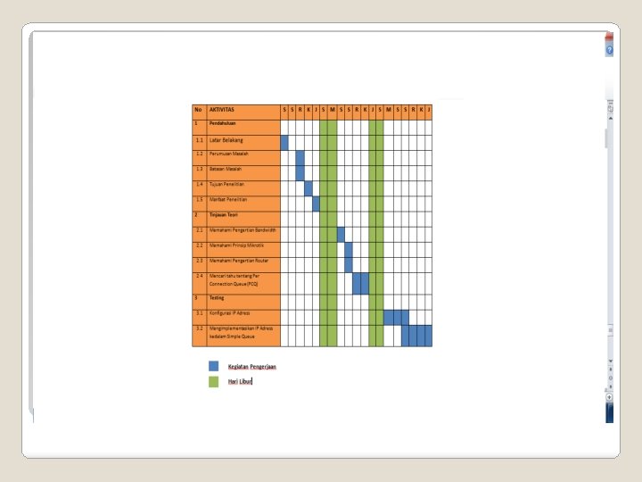 Tempat dan Waktu Penelitian di buat pada bulan November hingga Desember 2020. Penelitian ini dibuat dirumah saya yang ber alamat di Jalan Kalibaru Barat VII Rt. 010/Rw. 004 No. 08, Kalibaru, Cilincing Jakarta Utara Pengumpulan Data Observasi Mengamati komputer dikantor, Melihat Perbandingan data pada komputer satu dan komputer lainnya v Tinjauan Pustaka Penelitian ini akan diterapkan pembagian Bandwidth untuk dibagikan kepada pengguna yang telah dipesan, dan secara otomatis akan melakukan pengaturan pada mikrotik v