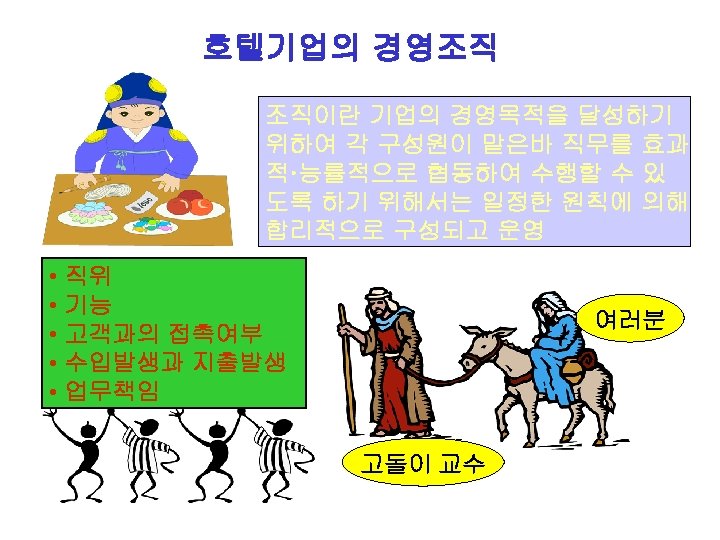 Front office 호텔업의 경영조직사례 Front desk, Guest Relation officer, Valet, Bell desk, PABX Housekeeping Room, Public, Order taker, Mini bar, Laundry, Linen, Flower shop Food & Beverage Kitchen Fine dining, Informal restaurant, deli shop, Bar, Room service Main kitchen, Cold kitchen, Butcher shop, Pastry & bakery, Steward, Sto Health club Trainer, Membership relation, Locker, Receptionist, Food &Beverage Contractors(shoe shine, massage, hair dresser) General affairs 관공서, 외국인관리, 차량관리, 보안