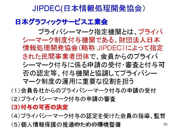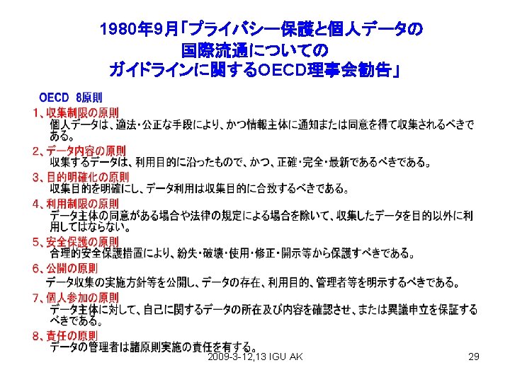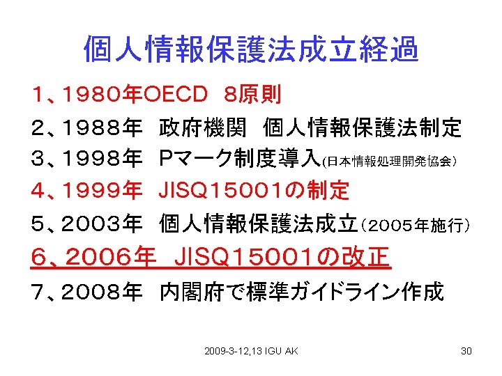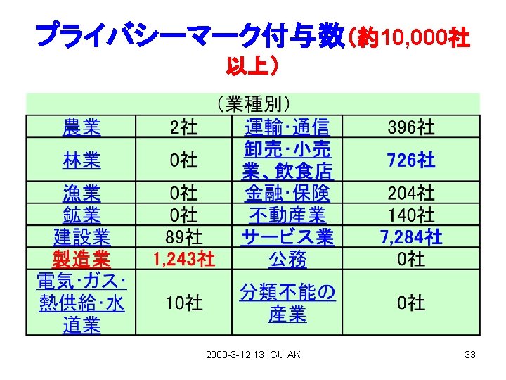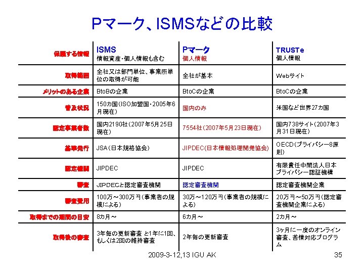 PマークとISMS 1、Pマーク;JISQ 15001は 1999年「個人情報保護に 関するコンプライアンス・プロ グラムの要求事項」策定、2 006年「個人情報保護マ ネージメントシステムの要求 事項」として改正。 2、ISMS;The ISO 27001 standard was published in October 2005, essentially replacing the old BS 77992 standard. It is the specification for an ISMS, an Information Security Management System. 2009 -3 -12, 13 IGU AK 32