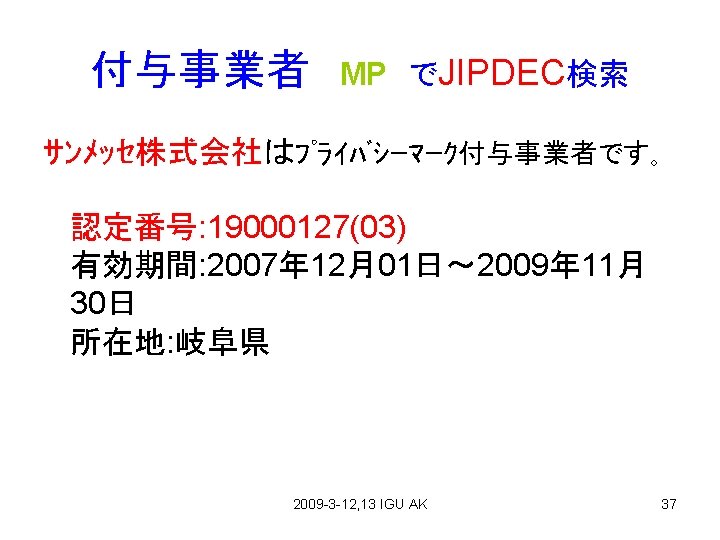 2、 P Mark Authorization of JAGRA Feb. 3、2009 in Tokyo 2009 -3 -12, 13 IGU AK 28