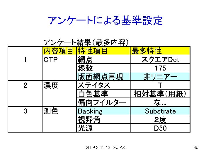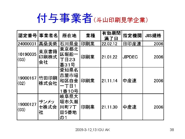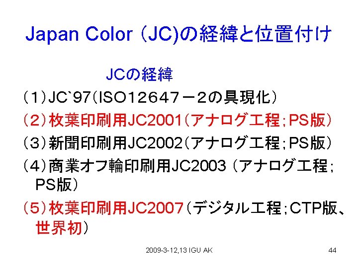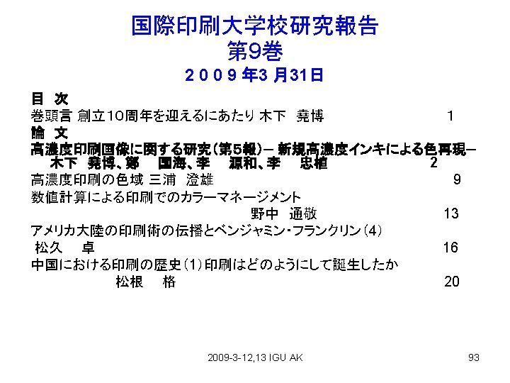 Contents 1、PAGE2009 (Feb. 4 -6) 2、P Mark Authorization(Feb. 3) 3、Japan Color Print 2007(Mar. 6) 4、Printing Accident(Mar. 5) 5、Environment(Mar. 5) 6、High Density Printing(Part 5) (Mar. 31 2009) 2009 -3 -12, 13 IGU AK 2