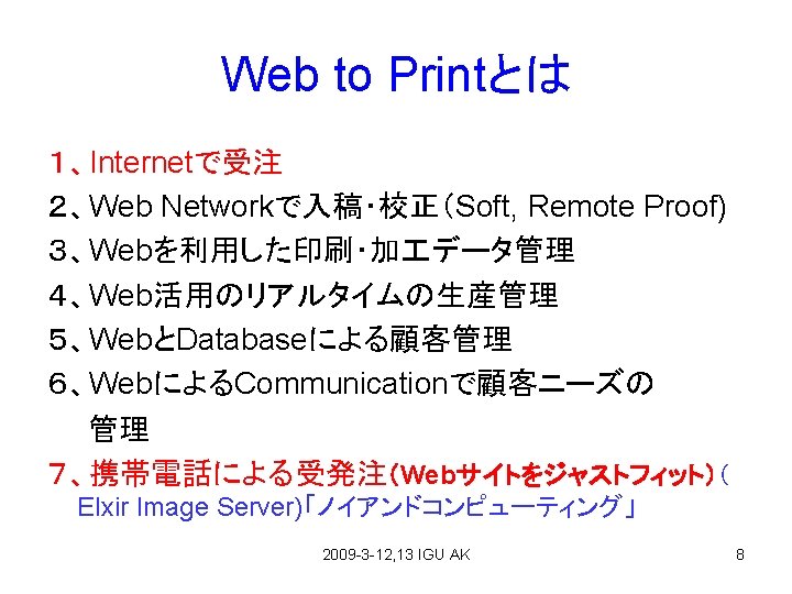 Items 1、Web to Print 、JDF(PAGE 2009) (Feb. 4~6, 2009) 2、Heidelberg Junior Forum & CD Meeting (Feb. 5, 2009) 3、P-Mark Authorization (Feb. 3, 2009) 4、Ink Jet Printing (Feb. 4, 2009) 5、Wide Color (Mar. 6, 2009、NAGOYA City) 6、Printing Improvement 7、Service Science Paper by Algae (KGCS)、Oil by Algae ( Mar. 16, 2009) Algae Fuel Forum 2009 -3 -12, 13 IGU AK 4