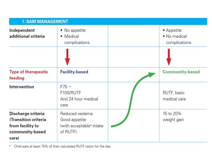 CRITERIA FOR DISCHARGE • Absence of infection • Child is eating at least 120 – 130 Kcal/Kg/day and is receiving adequate micronutrients • There is consistent weight gain (of at least 5 gm/Kg/day for 3 consecutive days) on exclusive oral feeding