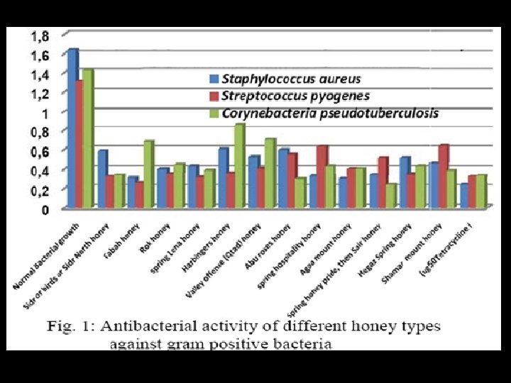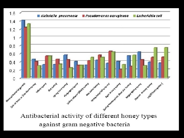 Conclusion • The results showed also that most of honey samples at 20. 30 % (w/v) can completely inhibit the growth of all of the tested bacteria. • It was clear that the different types of honey were less effective against E. coli than other bacteria.