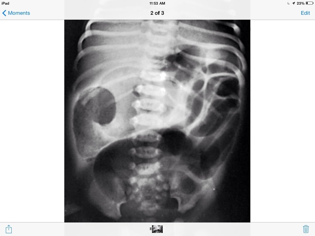 Malrotation with obstruction from midgut volvulus is an acute emergency that must be not only considered but also urgently evaluated by an upper gastrointestinal contrast radiographic series. Radiographs of the abdomen show the distribution of air in the intestine, which may point to the anatomic location of an obstruction; malrotation can be identified only by contrast studies. Normally, air can be demonstrated by radiographs in the jejunum by 15 -60 min, in the ileum by 2 -3 hr, and in the colon by 3 hr after birth. Absence of rectal gas at 24 hr is abnormal.