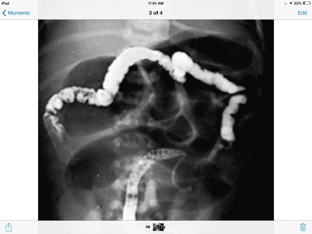 The differential diagnosis involves other causes of intestinal obstruction, including intestinal pseudo-obstruction and other causes of pancreatic insufficiency A presumptive diagnosis can be made on the basis of a history of CF in a sibling, via palpation of doughy or cordlike masses of intestines through the abdominal wall, and from the radiographic appearance. In contrast to the generally evenly distended intestinal loops above an atresia, the loops may vary in width and are not as evenly filled with gas. At points of heaviest meconium concentration, the infiltrated gas may create a bubbly granular appearance It is technically difficult to perform a sweat test in a neonate. Genetic testing confirms the diagnosis of CF.