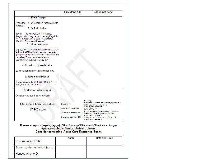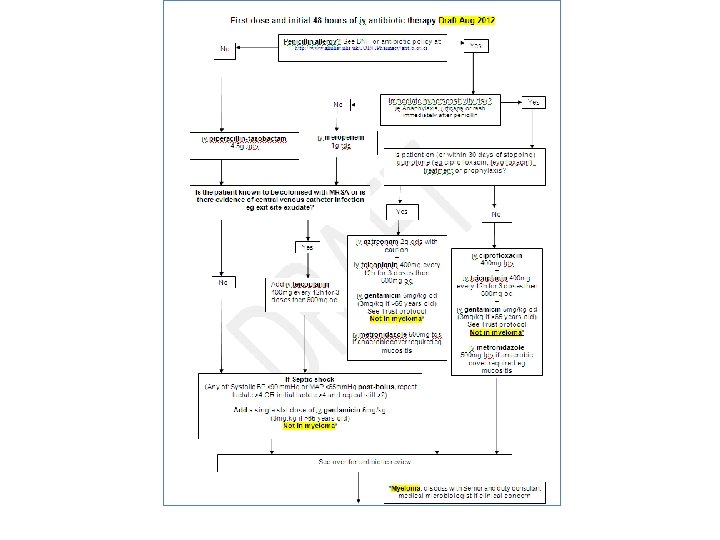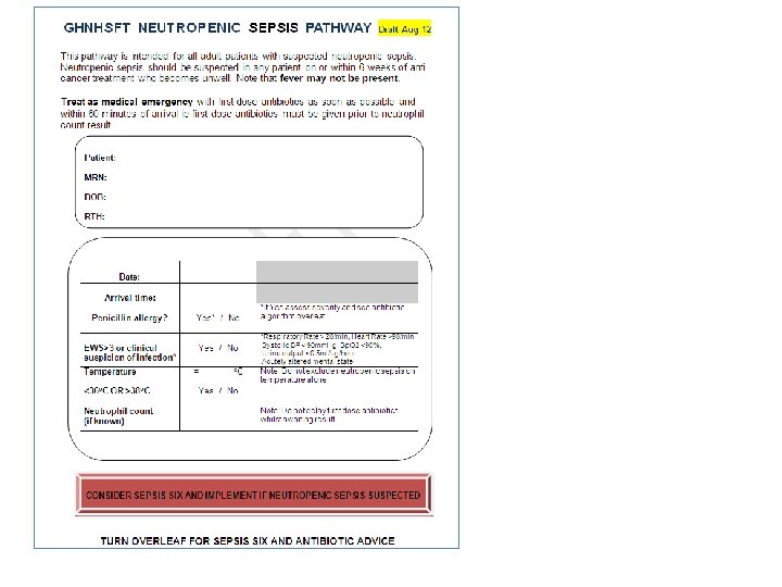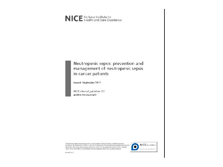 Initial assessment • Brief history – Symptoms – Recent chemotherapy – ‘Normal’ neutrophil count – Late onset neutropenia in rituximab patients • Limited examination – MEWs – not validated in neutropenic patients – Review of any obvious source