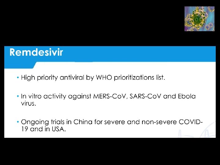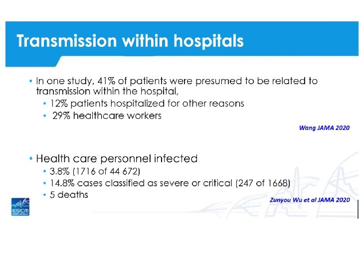 Transmission • • • Direct contact (hand to mucus membrane) Droplet (contact within 1 m of infected patient) Aerosols: Smaller airborne particles which can travel around a room