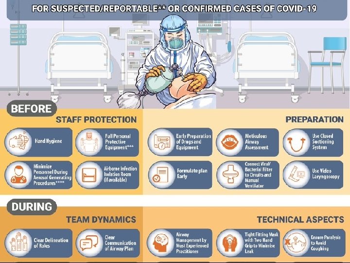Aerosol generating procedures • Procedures that produce aerosols of respiratory secretions carry an increased risk of transmission: – NIV/CPAP/HFNC – bronchoscopy – induced sputum – positive-pressure ventilation via a face mask – intubation and extubation – airway suctioning – CPR