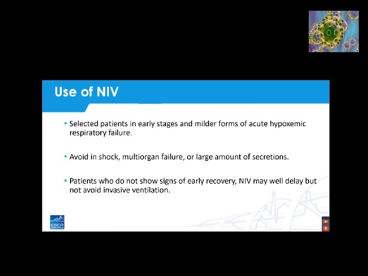 Respiratory Support • NIV/HFNC/Mask CPAP not contraindicated but results in aerosol production-must be delivered in a negative pressure isolation room • Most patients will have type I resp failure but require higher levels of CPAP than can be delivered with HFNC • Helmet CPAP may be the best NI option where available • Full face mask NIV may be an option • The rate of failure of NIV with COVID-19 is high • In general early IPPV is encouraged