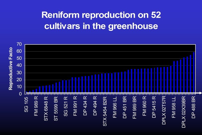 Cotton cultivar Evaluation Reniform nematode • 150 cc of sterile soil • Inoculated 1000 R. reniformis. • 60 days • Reniform were extracted combined gravity screening and sucrose centrifugal floatation. • Eggs extracted sodium hypochlorite. • Reproduction = Total reniform/initial number.