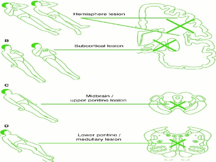 NEU. EXAM–MOTOR RESPONSES 3. Nailbed Pressure : • a) Withdrawl – Motor cortex • b) Decortication (Flexion of the Elbow & wrist with supination of the arm)– Deep Hemisphere / Upper midbrain level inv of pyramidal tract • c) Decerebration (Extension of Elbows Wrist & Pronation) – Pons / Upper medullary lesion