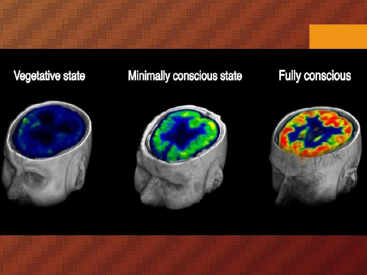 VEGETATIVE STATE • Loss of Awareness of self and surroundings. • Normal sleep wake cycles & BS reflexes. • Normal metabolic and circulatory functions. • Normal eye opening / closure & Swallowing. • Eye movements & Sensory Localization – Poor. • Doesn’t obey requ’s / No comprehensible words. • Preserved Hypothalamic & Autonomic fns. • Above findings lasting > 1 month – PVS. • CVA, SAH, Trauma, Toxin, Injury, Infn, Arrest etc. , • Low amplitude irregular Delta in EEG. • Cortical necrosis, multi-infarcts, Diffuse neuronal loss and gliosis of neocortex, hippocampus thalamus & purkinje cells – BS relatively intact.