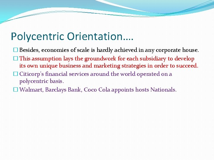 Polycentric Orientation…. � Besides, economies of scale is hardly achieved in any corporate house. � This assumption lays the groundwork for each subsidiary to develop its own unique business and marketing strategies in order to succeed. � Citicorp’s financial services around the world operated on a polycentric basis. � Walmart, Barclays Bank, Coco Cola appoints hosts Nationals.