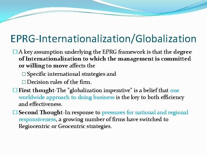 EPRG-Internationalization/Globalization � A key assumption underlying the EPRG framework is that the degree of Internationalization to which the management is committed or willing to move affects the � Specific international strategies and � Decision rules of the firm. � First thought-The "globalization imperative" is a belief that one worldwide approach to doing business is the key to both efficiency and effectiveness. � Second Thought-In response to pressures for national and regional responsiveness, a growing number of firms have switched to Regiocentric or Geocentric strategies.