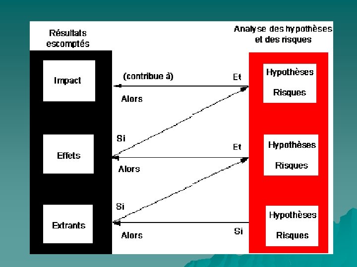 Hypothèses et risques u Les hypothèses décrivent les conditions nécessaires pour que se réalisent comme prévu la relation de cause à effet entre les niveaux de résultats ainsi que les conditions nécessaires pour assurer que les activités se transforment en extrants. u Les hypothèses incluent des conditions internes et externes au projet.