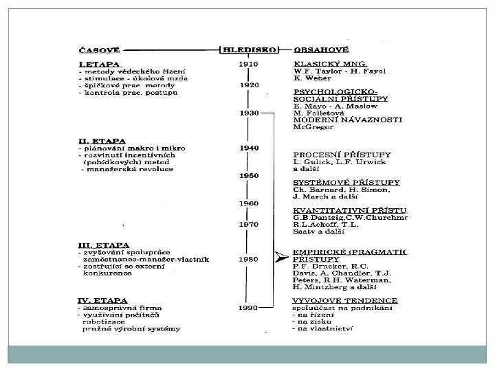 Vývoj teorií a modelů moderního managementu 1. období - konec 19. století - 30. léta 20. století F. W. Taylor, H. Gantt, manželé Gilberthovi, H. Ford, E. Mayo H. Fayol. M. Weber, 2. období - 40. léta 20. století - 70. léta 20. století manažerská revoluce Teorie procesního přístupu (Luther Gullick) Teorie systémového přístupu (L. Bertalanffy, Chester Barnard) Empiricko/pragmatické přístupy 3. období - konec 20. století Koncepce dokonalého podniku Peter. F. Drucker 4. období - 21. století Koncept znalostní společnosti Strategické zdroje: informace, znalosti, tvůrčí myšlení