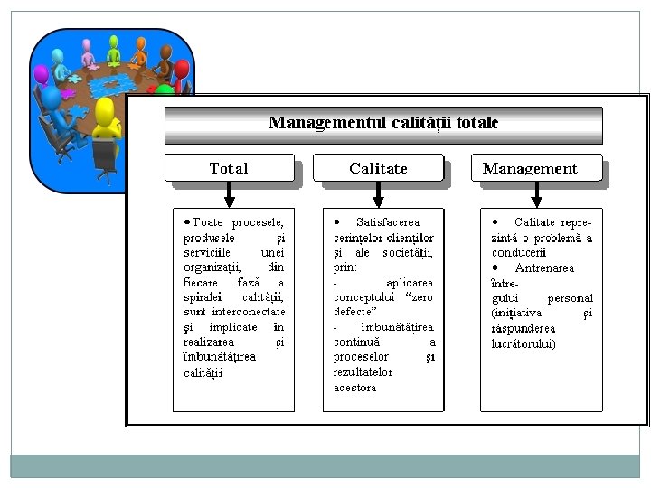 Elementele definitorii ale TQM sunt următoarele: �punctul central al tuturor activităţilor firmei îl constituiecalitatea; �calitatea se realizează prin antrenarea tuturor salariaţilor firmei; �firma urmăreşte asigurarea succesului pe termen lung prin satisfacerea clientului şi obţinerea de avantaje pentru salariaţii săi şi pentru societate.