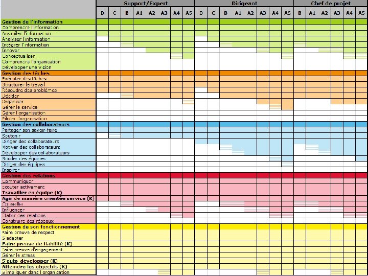5. Competency profile and the jobdescriptions Levels: D A 5 Competencies Information Management Task Management People Management Interpersonal Management Personal Management f. i. File Manager f. i. Teamleader